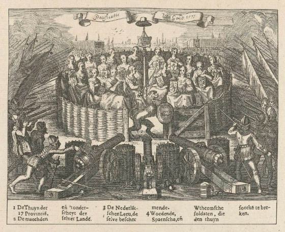 On 8th November 1576, the provinces of the Netherlands, regardless of their religious affiliations, signed an agreement whereby the whole of the Netherlands agreed to mutiny against the rule of Philip II of Spain, their hereditary duke. Philip’s great-grandmother, Mary of Burgundy, had inherited the lands from her father, Charles the Bold (or Rash, as he was sometimes termed). Mary had died young, falling from a horse, to be succeeded by her son, Philip, then her grandson, the Emperor Charles V. Charles had been brought up largely in Ghent and was therefore accepted as overlord, even though the day to day running of the Netherlands had been left first to his aunt, Marguerite, daughter of Mary, and then to his sister, Mary of Hungary. By the time Philip, born and brought up in Spain, succeeded, the familial link seemed very tenuous. By the 1570s around half the territories had converted to the Calvinist Reformed faith, whilst the southern areas remained largely Catholic. Whilst Philip came to terms with the leaders of the various provinces, peace did not last long.